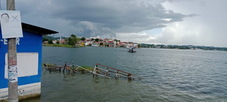 The boat ride to my hostel, which is in a miniature town called San Miguel directly opposite Flores Island, was all of 3-minutes and cost 10Q, it runs from 5am until 11pm every day and even takes motorbikes and cars. Tomorrow I will spend the day on the island and come back when I’ve seen and had enough. My hostel was a 2-minute walk from where the boat dropped me. It took me a while to work out how to get there without getting my feet wet as the lake was flooding the road. Eventually I realised that the wooden walkway went round the shop on the corner and was used as a pavement over the flood waters.