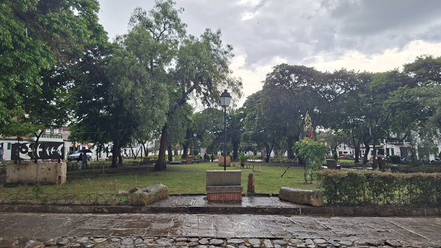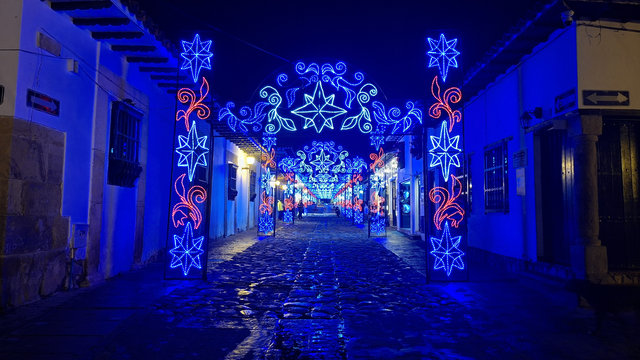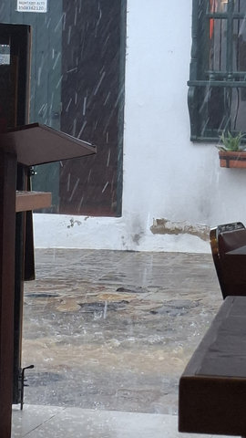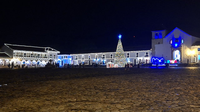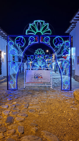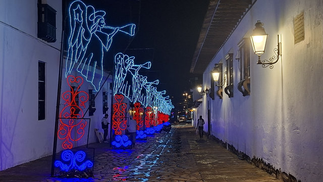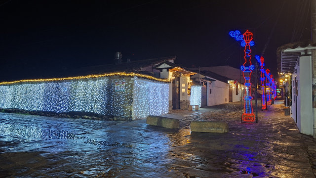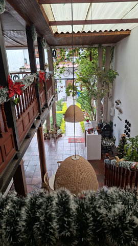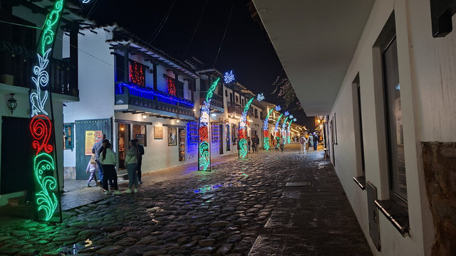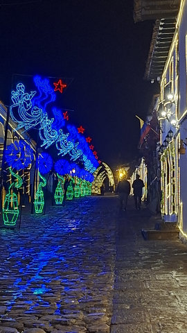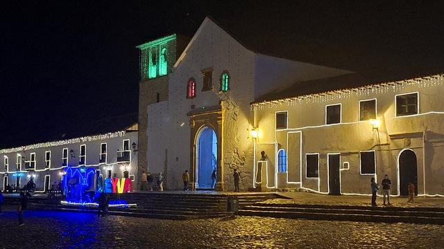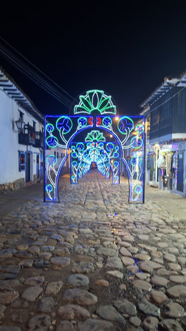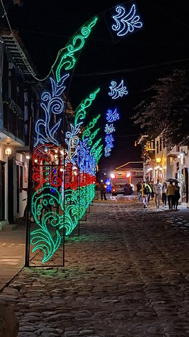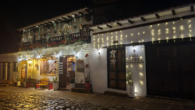 My hotel, Casa Gloria, which is the second most expensive for my stay in Colombia at £72 for 4 nights, was only a 6 minute walk from the bus terminal, and what a magical walk it was. The streets are all cobbled and the Christmas lights and decorations made it all look extra special. When I arrived at the hotel I had problems getting in as they had only sent me a phone number and not the entry code for the main door. I called the number but she only spoke in Spanish, luckily a guy came over, I think he may work here, and helped me get in and locate my key. WoW, this is a beautiful hotel, I’m glad I splashed out. Anyway, I dropped my bags and went for a walk. Like San Gil, there are a lot of shops were you have to drink the beer you buy there, I suppose they are the equivalent of a pub. I did see one with some spare seats but I feeling tired I didn’t fancy socialising. Eventually I found a little supermarket that sold take outs. Being late I only got one and brought it back to the hotel just in time to miss the rain.