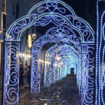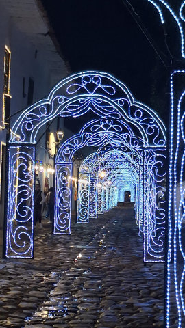 Before it got dark I went up to the roof terrace of the hostel, wow what a view. The backs of houses and roof tops of the town were stunning, all with red tiles on the roofs and many with no render on the walls, so only red brick showing, It was quite a spectacular sight set against the dark green and brown of the mountain peaks, with the rain clouds rolling in. Before the rains did come I went for a little walk to find a beer. By then it was dark and the Christmas lights were all on, it was just as magical as last night. I took a couple of photos before heading back but really do need to go out properly one evening and take lots of photos.